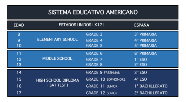 El sistema de educativo americano se compone de 12 cursos académicos que se denominan grados. En Estados Unidos la etapa que conocemos como High School va desde los 14 a los 18 años, desde el noveno hasta el duodécimo grado.